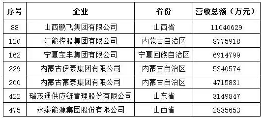 今年,共有7家民營煤炭企業(yè)上榜,分別為:山西鵬飛集團有限公司(第88位,營業(yè)收入11040629萬元)、匯能控股集團有限公司(第120位,營業(yè)收入8775918萬元)、寧夏寶豐集團有限公司(第162位,營業(yè)收入6914799萬元)、內(nèi)蒙古伊泰集團有限公司(第229位,營業(yè)收入5340574萬元)、內(nèi)蒙古蒙泰集團有限公司(第260位,營業(yè)收入4715831萬元)、瑞茂通供應(yīng)鏈管理股份有限公司(第422位,營業(yè)收入3149847萬元)、永泰能源集團股份有限公司(第475位,營業(yè)收入2835653萬元)。其中,山西鵬飛集團有限公司、匯能控股集團有限公司、寧夏寶豐集團有限公司的營業(yè)收入較上年有所提升,其余4家企業(yè)營業(yè)收入出現(xiàn)下滑,去年上榜的美錦能源集團有限公司今年未上榜。